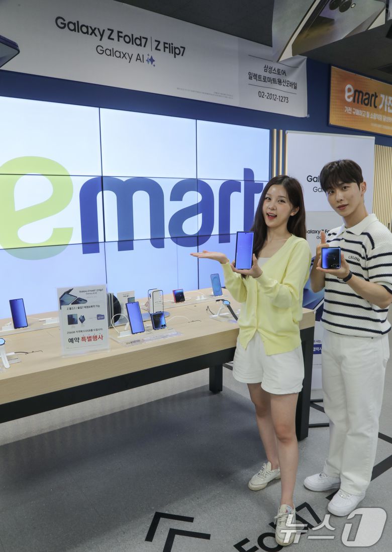(서울=뉴스1) = 이마트는 '갤럭시 Z 폴드 7', '갤럭시 Z 플립 7' 사전예약 접수를 시작했다고 14일 밝혔다. 14일 서울 용산구 이마트 용산점에서 모델들이 일렉트로 마트에서 사전예약을 진행하는 '갤럭시 Z 폴드 7', '갤럭시 Z 플립 7'을 소개하고 있다. (이마트 제공. 재판매 및 DB금지) 2025.7.14/뉴스1