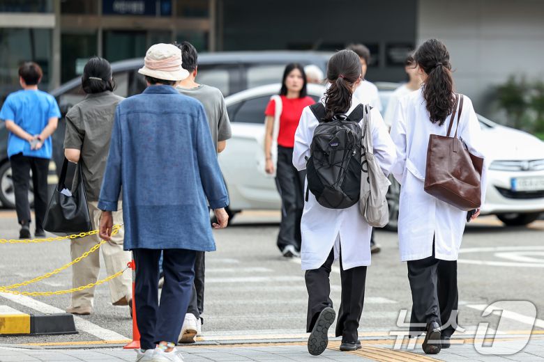 (서울=뉴스1) 민경석 기자 = 1년 반 가까이 학교를 떠났던 전국 의과대학 학생들이 전원 복귀를 선언하면서 전공의 복귀 시점에 관심이 쏠리고 있다. 대한전공의협의회(대전협)는 14일 국회 보건복지위원장인 박주민 더불어민주당 의원 등을 만나 해법을 논의할 계획이다. 이날 서울의 한 대학병원에서 의료진이 오가고 있다. 2025.7.14/뉴스1