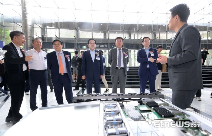 한국데이터센터연합회와 전자신문이 공동 주최한 '2025 데이터센터 서밋 코리아'가 '지속가능한 데이터센터 산업 A to Z'를 주제로 14일 서울 강남구 코엑스에서 열렸다. 행사에 참석한 주요 인사들이 넷앱 부스를 둘러보고 있다.