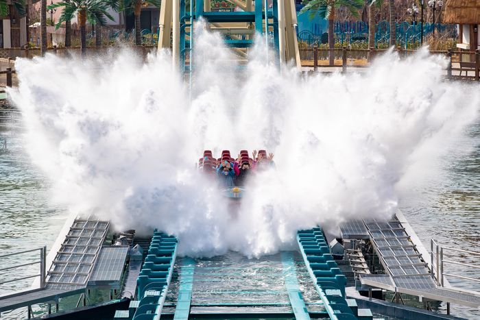 대표 어트랙션인 ‘자이언트 스플래쉬’다. ‘자이언트 스플래쉬’는 국내 최초로 도입된 롤러코스터와 후룸 라이드를 결합한 독창적인 기종이다. 44.6m높이에서 약 2000톤의 물이 담긴 수로를 향해 시속 100㎞로 급하강해 거대한 물보라를 일으키는 어트랙션으로, 마치 샤워를 한 듯 전신이 물에 흠뻑 젖는 이색 경험이 가능하다.