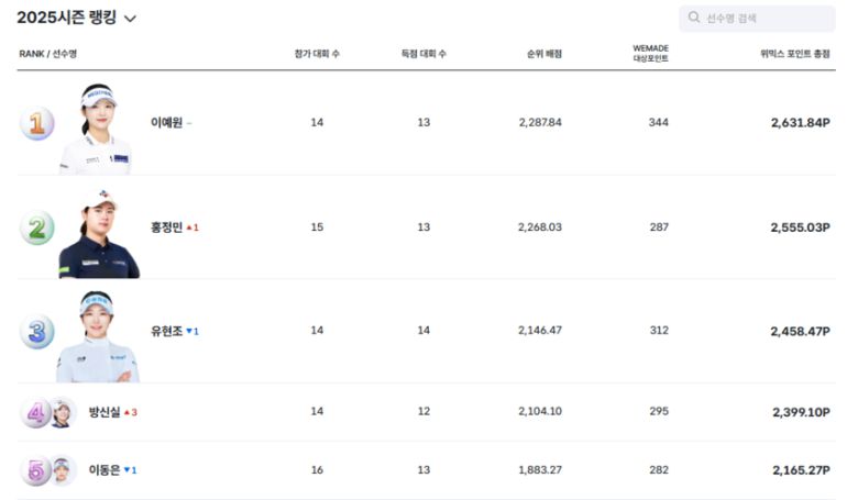 금주 위믹스 포인트 랭킹 TOP5는 1위 이예원(2,631P), 2위 홍정민(2,555P), 3위 유현조(2,458P), 4위 방신실(2,399P), 5위 이동은(2,165P)이다. 선수별 보다 자세한 순위는 위믹스 포인트 랭킹 홈페이지(https://wemix.golf.sbs.co.kr/point)를 통해 확인할 수 있다.