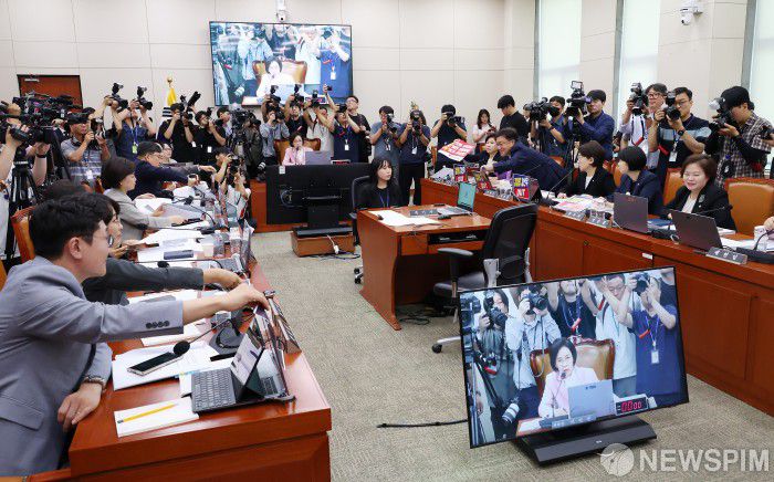 [서울=뉴스핌] 정일구 기자 = 14일 오전 서울 여의도 국회 여성가족위원회에서 열린 강선우 여성가족부 장관 후보자 인사청문회에서 여야 의원들이 이인선 위원장의 중재 하에 피켓을 떼고 있다. 2025.07.14 mironj19@newspim.com