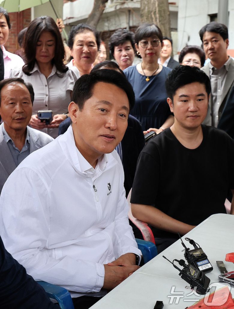 (서울=뉴스1) 박지혜 기자 = 오세훈 서울시장이 14일 서울 광진구 자양4동 신통기획 재개발 현장에서 주민들과 간담회를 갖고 있다. 이날 오 시장은 신속통합 재개발 지역으로 지정된 자양4동 A구역을 찾아 지역 주민들로부터 현장 목소리를 청취했다. 자양4동 A구역은 재개발 사업을 통해 약 3000가구 한강 조망 아파트 단지로 탈바꿈할 전망이다. 2025.7.14/뉴스1