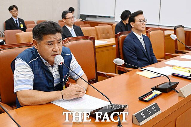 이상국 해양수산부 노조 지부장(왼쪽)이 14일 오후 서울 여의도 국회 농림축산식품해양수산위원회에서 열린 전재수 해양수산부 장관 후보자 인사청문회에서 해수부 부산 이전에 관한 의원 질의에 답하고 있다. /국회=남용희 기자