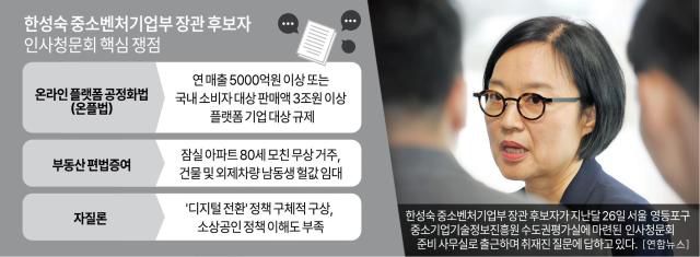 한성숙 중소벤처기업부 장관 후보자에 대한 국회 인사청문회에서는 '부동산 편법증여' 의혹을 포함해 온라인플랫폼 공정화법(온플법), 소상공인 지원 역량 등이 쟁점이 될 전망이다.