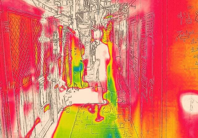 폭염이 강타한 9일 서울 종로구 쪽방촌에서 더위를 피하고 있는 한 주민을 열화상 카메라로 촬영한 모습. 온도가 높은 곳이 더 붉다. 연합뉴스 |