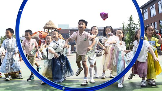 지난 5월 30일 중국 허난성 지위안시의 한 유치원 원생들이 민속 놀이를 즐기고 있다. 최근 중국의 심각한 저출산 문제로 올 한 해 2만6000개 유치원이 원생 감소로 문을 닫을 전망이다. 신화=연합뉴스 |