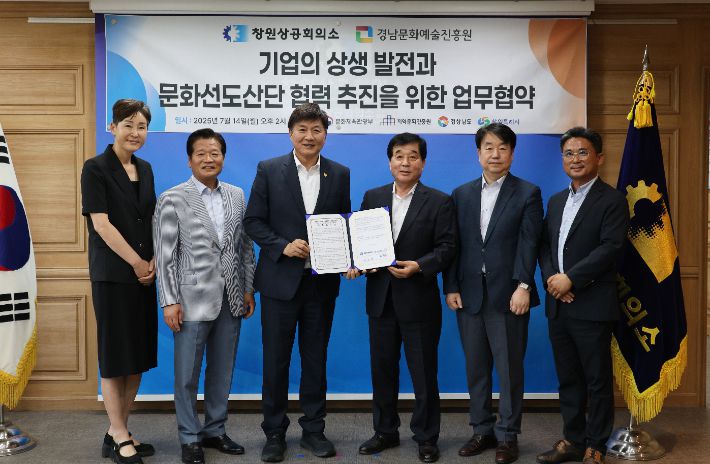 창원상의는 14일 경남문화예술진흥원과 '기업의 상생발전과 문화선도산단 협력 추진을 위한 업무협약'을 체결했다. 협약식에는 최재호 창원상공회의소 회장, 김종부 경남문화예술진흥원 원장 등 관계자 10여 명이 참석했다.