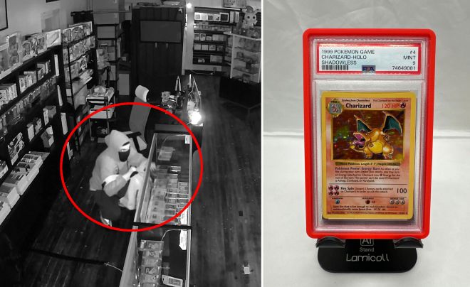 고가의 포켓몬 카드를 훔치고 있는 도둑(왼쪽)과 그가 훔친 카드 중 하나. 이는 BGS 9 골드 스타 리자몽 카드로 시세는 최소 2760만 원에서 최대 4140만원에 형성돼 있다. 출처=퍼스트 에디션 컬렉터블스 페이스북 |