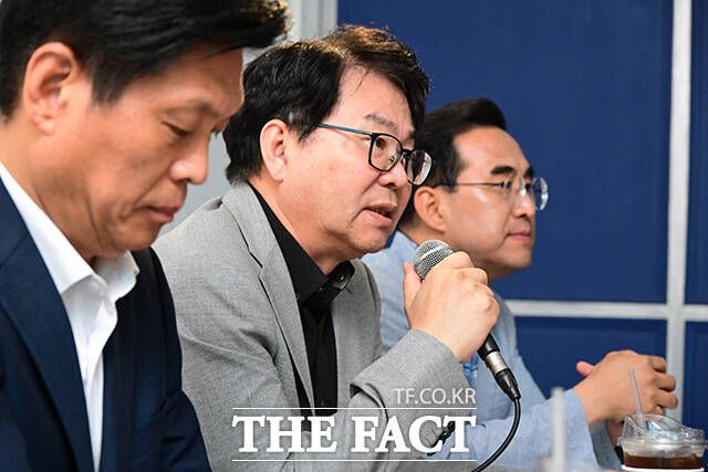 대통령 직속 국정기획위원회가 오는 15일 중앙선거관리위원회 업무보고를 진행한다고 밝혔다. 사진은 이한주 국정기획위원장(가운데)이 13일 오후 서울 종로구의 한 카페에서 기자간담회를 열고 발언하는 모습. /남윤호 기자