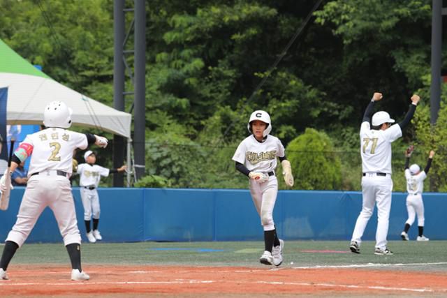 대구 칠성초 이도윤이 5회말 경기의 쇄기를 박는 3점 홈런으로 주자를 불러들이는 장면. 울진=박상은 기자