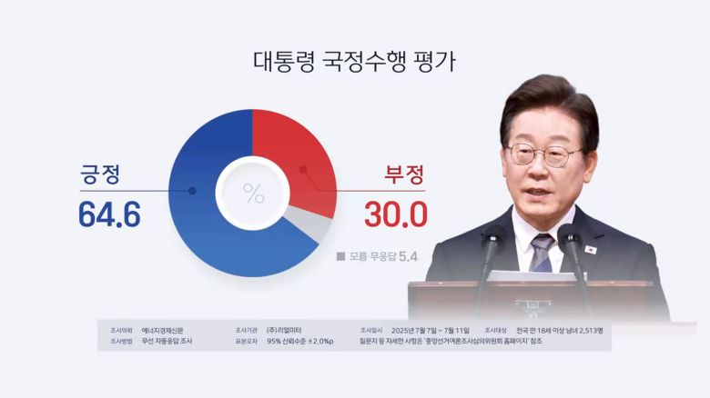리얼미터가 에너지경제신문 의뢰로 지난 7일부터 11일까지 전국 만 18세 이상 유권자 2,513명을 대상으로 조사한 결과, 대통령이 국정 수행을 잘한다고 평가한 응답자는 64.6%로 전주보다 2.5%p 상승했습니다.