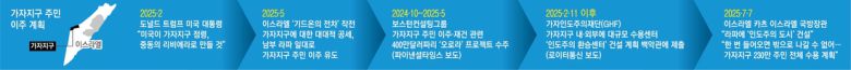 같은 날, 이스라엘 카츠 이스라엘 국방장관은 가자지구 남부 도시 라파에 ‘인도주의 도시’를 짓고 장기적으로 230만명 가자 주민을 전부 수용하겠다는 계획을 내놨다. 보안 심사를 거쳐 들어간 가자 주민은 해외로 떠나지 않는 한 이곳을 나올 수 없다. ‘지붕 없는 감옥’에서 영원히 살거나 타국으로 떠나거나, 둘 중 하나를 선택하라는 것이다.