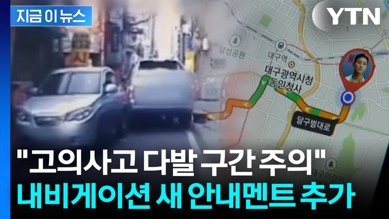 이 지역을 진입할 경우, 내비게이션 앱 '티맵'을 통해 고의 교통사고 다발구간임을 알려주고 차선이탈, 보행자와 차량 통행에 유의하라는 안내 음성이 나옵니다.