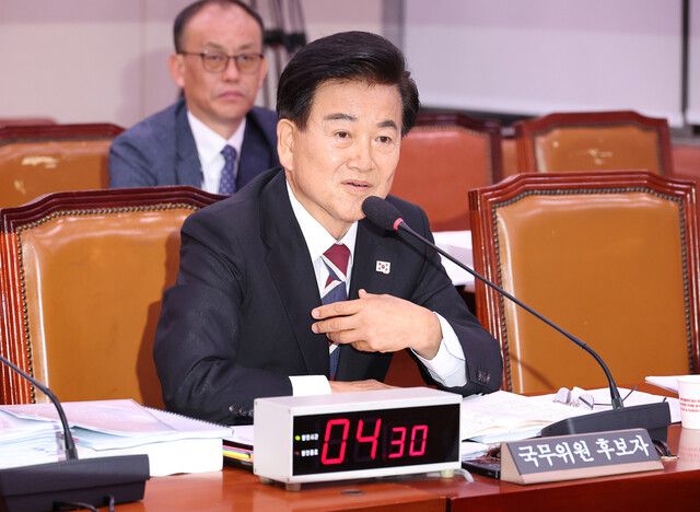 정동영 통일부 장관 후보자가 14일 국회 외교통일위원회에서 열린 인사청문회에 출석해 의원 질의에 답변하고 있다. 연합뉴스 |