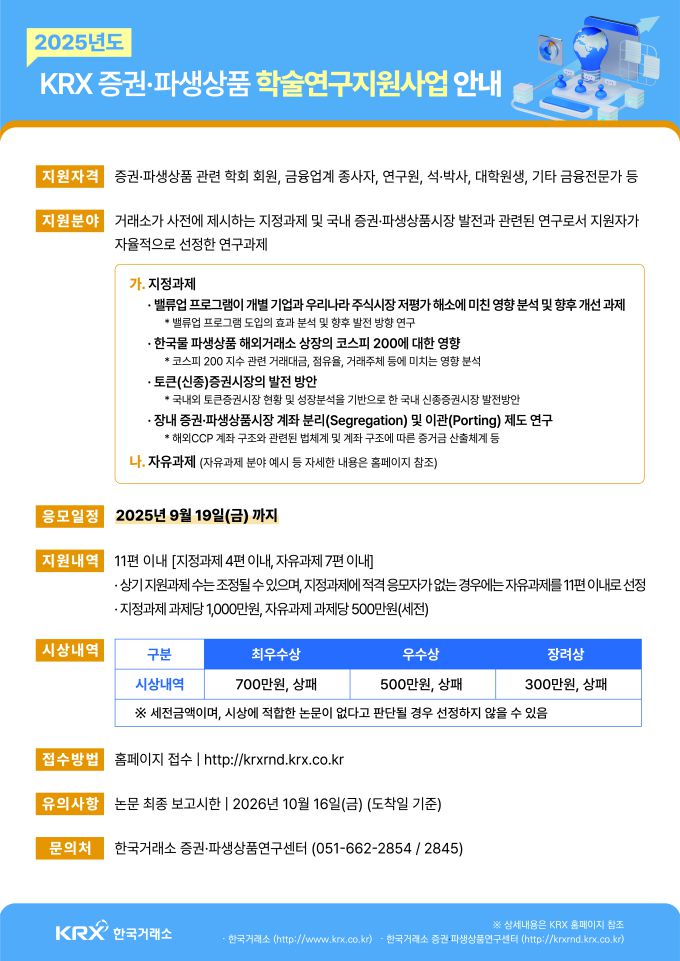 한국거래소, '2025년도 KRX 증권·파생상품 학술연구지원사업' 실시
