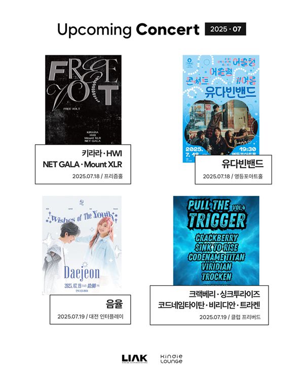 한국음악레이블산업협회(음레협)가 운영하는 킨디라운지는 7월을 맞아 대중음악의 실험성과 현장성을 담은 공연들을 소개한다. 전자음악, 청춘밴드, 싱어송라이터, 하드 록까지 다채로운 장르의 공연들이 관객들을 맞이할 준비를 하고 있다.