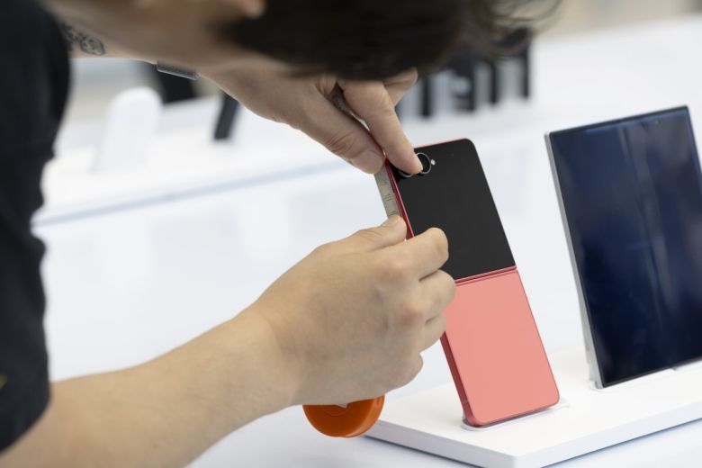 삼성전자 신형 폴더블 스마트폰 갤럭시 Z 폴드7 및 플립7 공개 첫 날인 10일 서울 서초구 삼성 강남점에서 한 소비자가 제품 길이를 확인하고 있다. 2025.07.10.  뉴시스