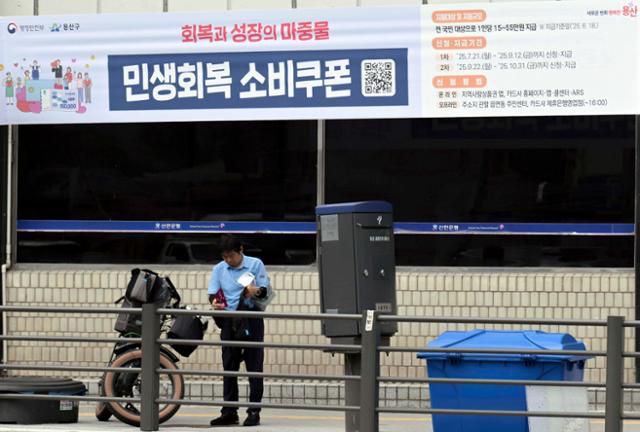 14일 서울 용산구 한 도로변에 민생회복 소비쿠폰 신청 안내문이 걸려 있다. 강예진 기자