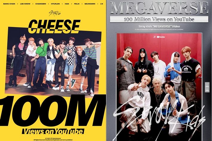 소속사 JYP엔터테인먼트는 스트레이 키즈의 '치즈'(CHEESE) 뮤직비디오가 14일 오전 7시 30분쯤 유튜브 조회 수 1억 회를 넘겼다고 이날 밝혔다. 하루 전인 13일에는 '메가버스'(MEGAVERSE) 뮤직비디오가 유튜브 조회수 1억 회를 돌파했다. '메가버스'는 16번째, '치즈'는 17번째 1억 뷰 뮤직비디오다.