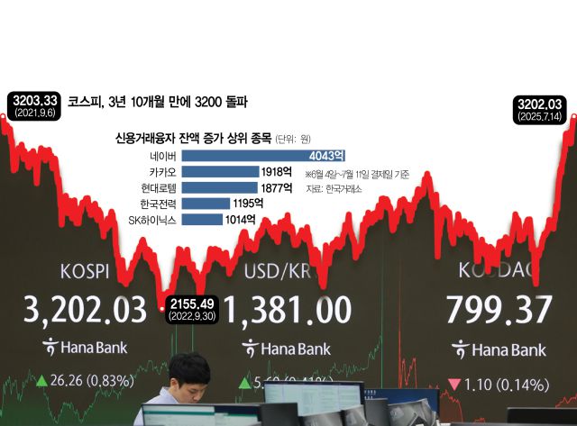 개인들은 주로 AI·방산 종목에 빚을 내 투자했다. 이 대통령 당선 직후인 지난달 4일부터 이달 11일(결제일 기준)까지 네이버(NAVER(035420))의 신용거래융자 잔액은 4043억 원가량 늘어나면서 이 기간 순증 규모가 가장 컸다. 다음으로는 카카오(035720) 1918억 원, 현대로템(064350) 1877억 원, 한국전력(015760) 1195억 원, SK하이닉스 1014억 원 등이다.
