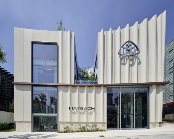 14일 서울 강남구 압구정동에 개관한 ‘마이바흐 브랜드센터 서울’의 외관. 주름진 외벽은 한복 치맛자락이 흐르는 곡선을 형상화했다. 메르세데스-벤츠 코리아 제공 |