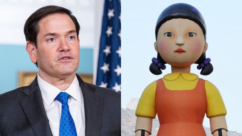 마코 루비오 미 국무장관 겸 국가안보보좌관. 오른쪽은 오징어게임의 영희 캐릭터.