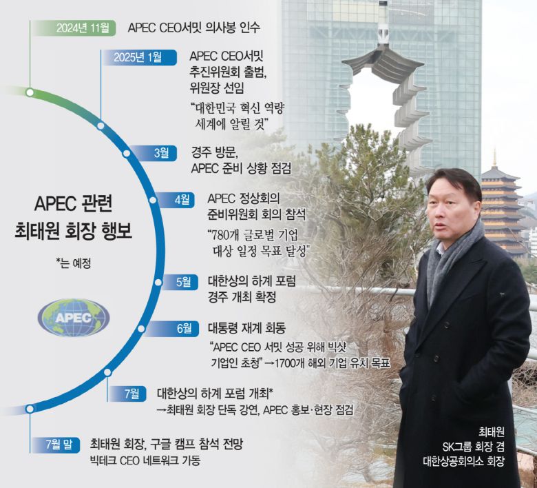 올 3월 최 회장은 경주를 찾아 행사장 부지와 지역 인프라를 직접 점검했다. 이 자리에서 그는 "APEC CEO 서밋은 아태 지역의 경제 리더들이 모여 미래 성장과 협력 방향을 모색하는 중요한 행사"라면서 "경주·경북뿐만 아니라 지역 경제 전반에 활력을 불어넣는 계기가 될 수 있도록 지자체와 기업이 긴밀히 협력할 수 있기를 기대한다"며 참가자 숙소부터 만찬장, 부대행사 개최지도 두루 살폈다. 이후에도 APEC 정상회의 준비위원회에 참석한 최 회장은 민관이 협력해 행사를 역대 최대 규모로 만들겠다고 다시 다짐했다. 글로벌 네트워크를 보유한 기업들과 직접 접촉하면서 글로벌 CEO의 참석을 독려하고 나서면서다. 당시 최 회장은 약 780개 기업과 접촉해 초청 등 절차를 진행 중이라고 밝혔다.
