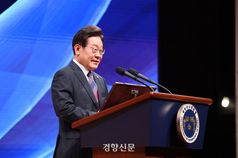 이재명 대통령이 13일 서울 강남구 코엑스에서 열린 2025 세계정치학회(IPSA) 서울총회 개막식에서 연설하고 있다. 대통령실사진기자단