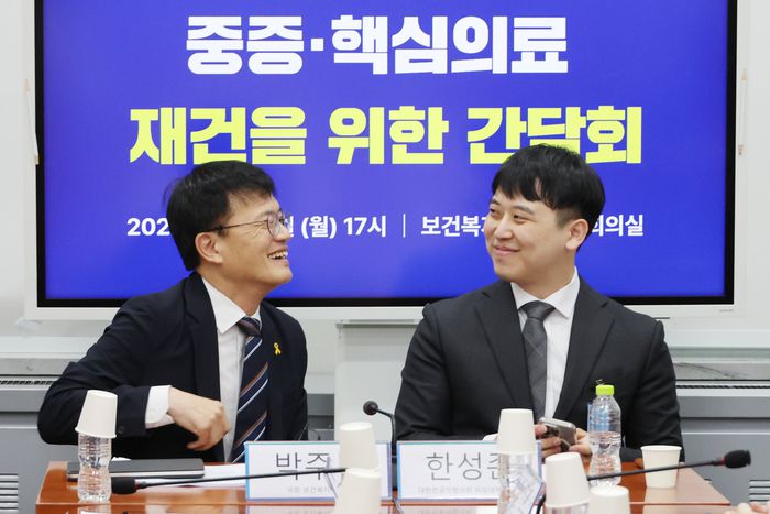14일 서울 여의도 국회 보건복지위원회 소회의실에서 열린 중증·핵심의료 재건을 위한 간담회에서 박주민 위원장과 대한전공의협의회 한성존 신임 비상대책위원장(오른쪽)이 대화하고 있다. (자료: 연합뉴스) |