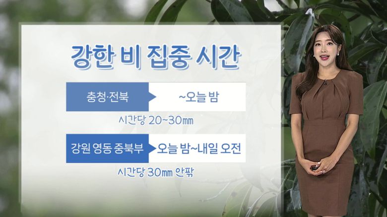 충청과 전북은 오늘 밤까지, 강원 영동 중북부는 오늘 밤부터 내일 오전 사이, 시간당 30mm 안팎의 물벼락이 쏟아져 호우특보가 내려질 수 있겠습니다.