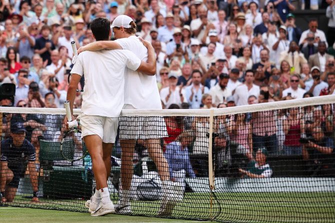 신네르는 이번 윌블던 대회 전까지 알카라스에 5연패를 당했다. 올해 프랑스오픈 결승에선 먼저 두 세트를 따내고 내리 세 세트를 내줘 역전패 당하는 수모를 겪기도 했다.