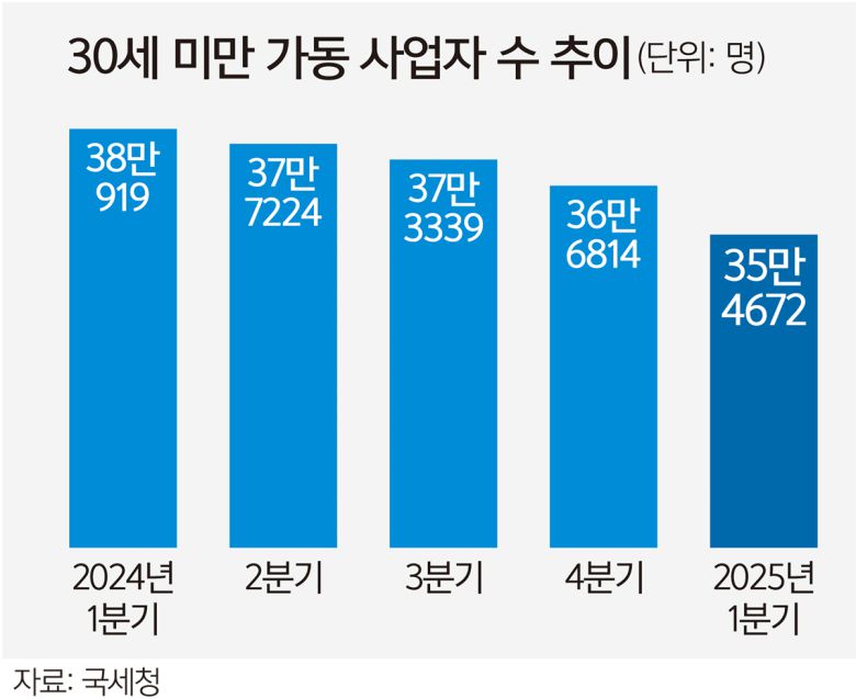 내수 부진이 장기화하면서 어렵게 시작한 회사 문을 닫거나 아예 창업을 포기하는 청년사업자가 늘고 있다. 14일 국세청 국세통계포털에 따르면 올해 1분기 사업체를 운영 중인 30세 미만 청년 사업자는 35만4672명(월평균)으로 1년 전보다 2만6247명 감소했다. 관련 통계가 집계되기 시작한 2017년 9월 이후 가장 큰 폭으로 감소했다.