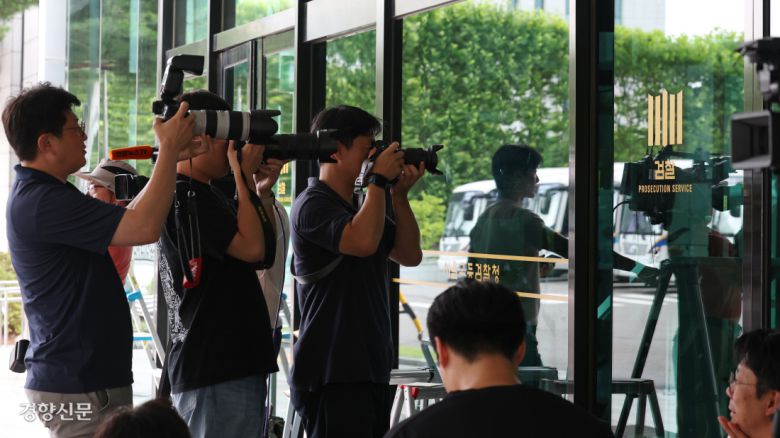 오지 않는 ‘윤’을 기다리며 윤석열 전 대통령이 소환 조사에 재차 불응한 14일 취재진이 내란 특검 사무실이 있는 서울 서초구 서울고검 청사 내부를 촬영하고 있다. 정효진 기자 hoho@kyunghyang.com