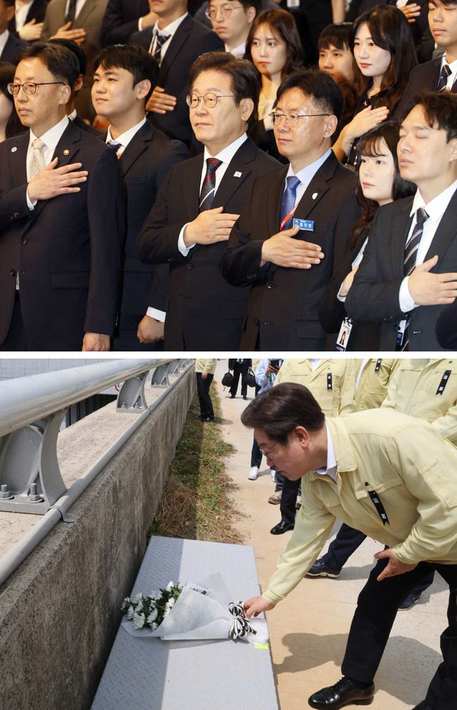 진천서 강연 마치고…‘2주기’ 오송 참사 현장 찾아 헌화 이재명 대통령이 14일 충북 진천군 국가공무원인재개발원에서 열린 5급 공채 합격자 대상 신임 관리자 특강에 앞서 국민의례를 하고 있다(위 사진). 이날 이 대통령이 2023년 7월15일 폭우로 침수돼 14명이 사망한 청주시 오송읍 궁평2지하차도 참사 현장을 방문해 헌화하고 있다. 대통령실사진기자단 |