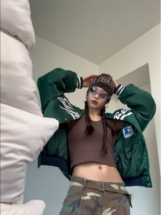 공개된 사진 속 금새록은 힙한 스트릿 감성으로 눈길을 사로잡았다. 짙은 초록색 바시티 재킷에 카모플라주 카고 팬츠를 매치해 쿄카 특유의 스트릿 무드를 완벽하게 살렸다. 포인트는 과감한 미드리프 룩. 크롭 브라운 톱으로 복부 라인을 시원하게 드러내며 탄탄한 바디라인을 자랑했다. 머리는 트윈 브레이드로 연출해 더욱 캐주얼한 매력을 배가시켰다.