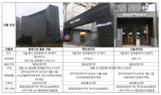 케이에이치엘제일차의 경우 대출채권 유동화거래의 주관회사가 메리츠증권이다. 이밖에도 남산드림힐튼제일차는 교보증권, 비욘드남산제사차는 한국투자증권, 모니모남산제일차는 삼성증권이 주관회사를 맡고 있다.