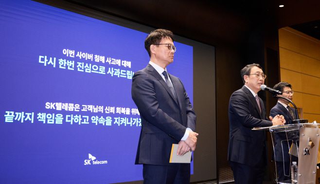 유영상 SK텔레콤 사장(가운데)이 4일 서울 중구 T타워에서 열린 기자간담회에서 5000억원 규모의 '고객 감사 패키지' 시행 계획 등을 설명하는 모습./SK텔레콤