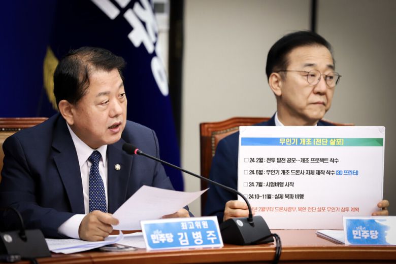 김병주 더불어민주당 최고위원은 윤석열 정부가 지난해 2월부터 무인기를 활용한 북한 도발 유도 공작을 시작한 정황이 있다고 14일 밝혔다. 드론작전사령부(드론사)가 지난해 10~11월 세차례에 걸쳐 무인기 7대를 북한에 날려보낸 사실도 공개했다.