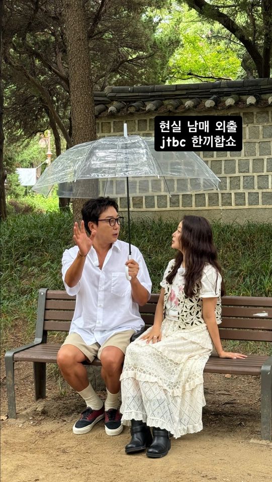 김희선은 14일 자신의 SNS에 “현실 남매 외출, 한끼합쇼”라는 글과 함께 근황을 전했다. 공개된 사진에는 탁재훈과 함께 공원 벤치에 앉아 비 오는 날의 여유를 즐기는 모습이 담겼다.