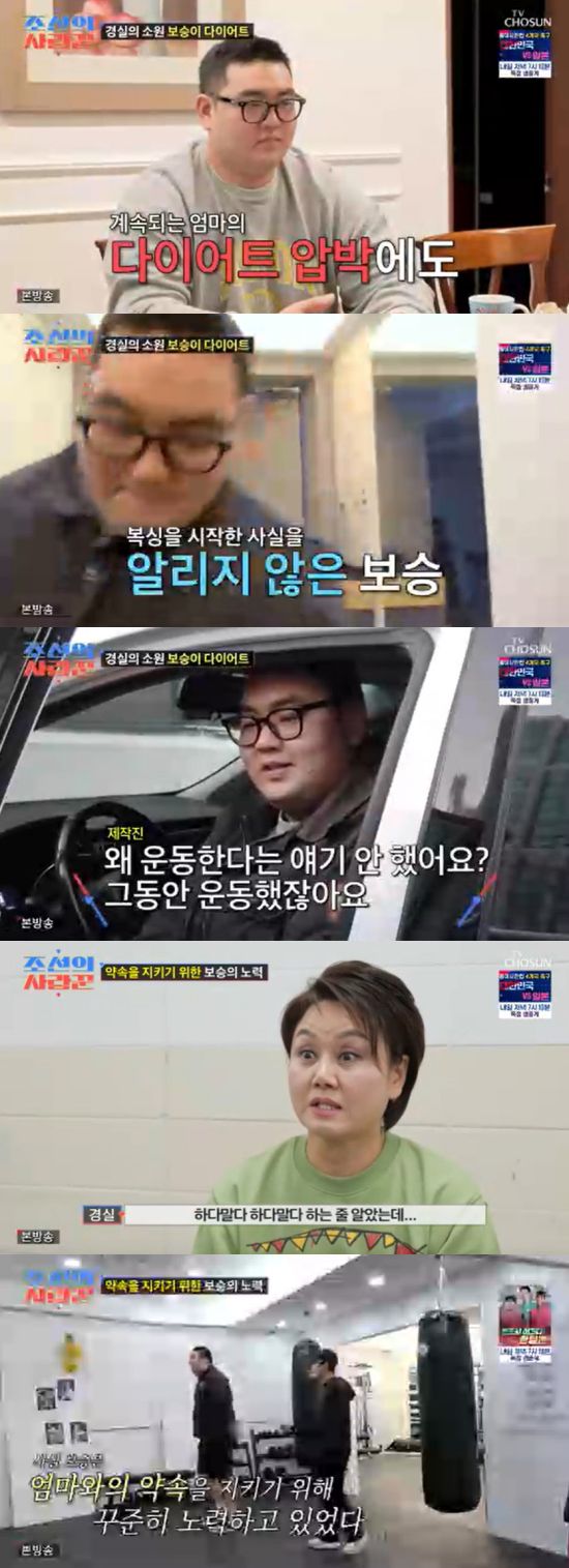 그러나 손보승은 몸무게가 크게 달라지지 않아 이경실에게 독촉을 당하면서도 복싱장에 다닌다는 사실을 밝히지 않았다. 제작진은 이경실에게 복싱을 언급하지 않는 이유를 물었고, 손보승은 "약속이 운동하는 게 아니고 살을 빼는 거였으니까 말 안 하고 (살 빠진 모습을) 보여드리려 했다"라며 귀띔했다.
