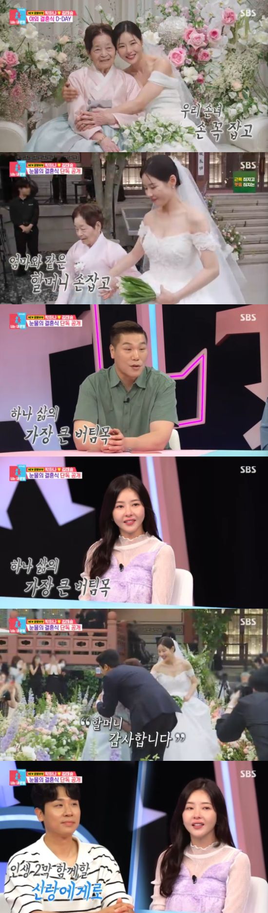 특히 박하나는 엄마를 대신해 할머니의 손을 잡고 입장했다. 박하나는 "할머니가 지금 93세다. 그런데 할머니가 치매가 왔는데, 예쁜 치매다. 다행하게도 결혼식날 할머니 컨디션이 좋으셨다"고 했다. 이어 "부모님이 바쁘셔서 할머니가 키워주셨다. 엄마보다 더 엄마라고 부를 수 있는 존재라고 해야하나..."라면서 눈물을 보였다.