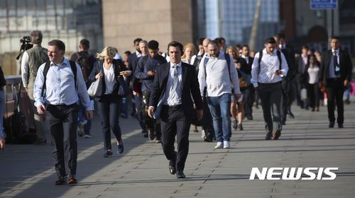 【런던=AP/뉴시스】영국 런던 브리지에서 5일(현지시간) 출근길의 시민들이 오가고 있다. 3일 밤 런던브리지와 인근 보로마켓에서 차량 및 흉기 테러가 발생해 많은 사상자가 초래됐다. 2017.06.05