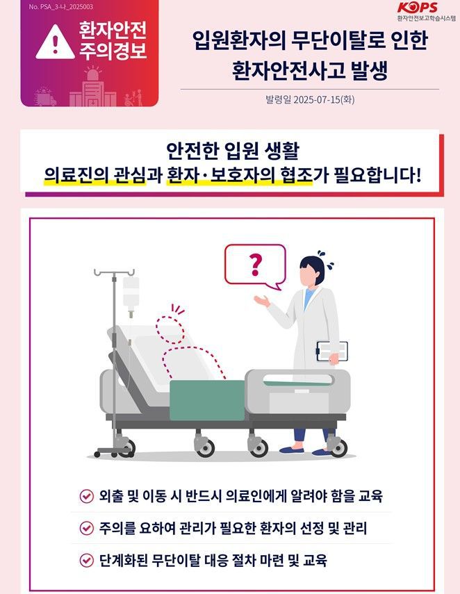 이번 발령한 주의경보는 입원 환자의 무단이탈로 인해 발생한 환자 안전사고 사례, 재발 방지를 위한 권고사항, 예방 활동 등을 중심으로 구성돼 있다.