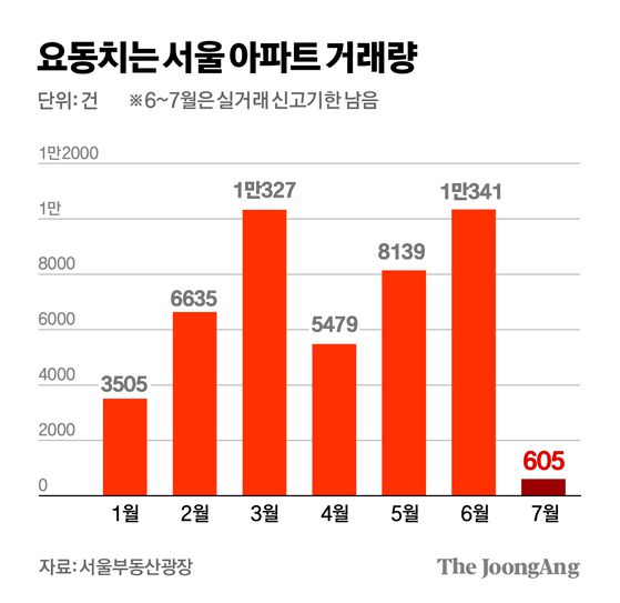 서울 아파트 거래량은 올해 들어 비정상적인 급등락을 거듭하고 있다. 지난해 하반기 이후 올 1월까지 3000건대를 유지하던 거래량은 2월 6635건, 3월 1만327건으로 급증했다. 하지만 4월엔 5479건으로 반 토막이 났다. 이후 3단계 스트레스 총부채원리금상환비율(DSR) 시행 전 ‘막차’ 수요와, 서울시의 토지거래허가구역(토허제) 재지정에 따른 풍선 효과가 나타나며 5월(8139건)과 6월(1만341건) 거래량은 급증했다. 기습적인 6·27 대출 규제가 나오며 7월 거래량은 14일 기준 605건으로 급락했다. 최근 서울 전역의 거래 절벽 현상을 고려할 때 7월 거래량은 4000건 이하로 내려갈 가능성이 크다.