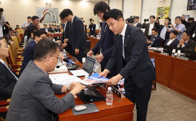 14일 국회 과학기술정보방송통신위에서 열린 배경훈 과학기술정보통신부 장관 후보자 인사청문회에서 국회 경위들이 최민희 위원장의 요청에 따라 국민의힘 과방위원들이 노트북 앞에 붙인 인쇄물을 제거하고 있다. 고영권 기자 |