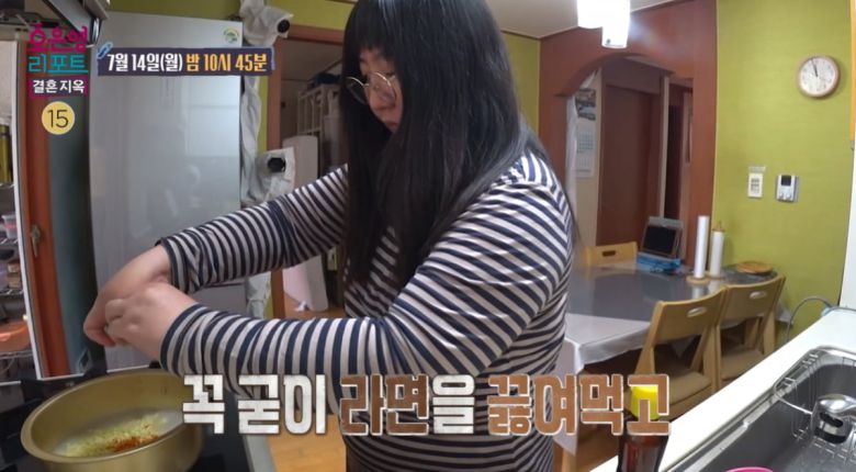 이날 방송에서는 부목사인 남편이 교회로 출근한 사이 하루 종일 아무것도 하지 않고 소파에 앉아 텔레비전을 보는 아내의 일상이 그려졌다. 인터뷰에서 남편은 혼자 집에 있으면서 집안일도 잘하지 않고 자신의 식사도 제대로 챙기지 못하는 아내가 불만이라고 말했다. 특히 최근 2년 급격히 살이 쪘음에도 매일 세 끼를 라면, 라죽(라면+죽), 통조림 햄으로 식사하는 아내가 걱정이라고 밝혔다.