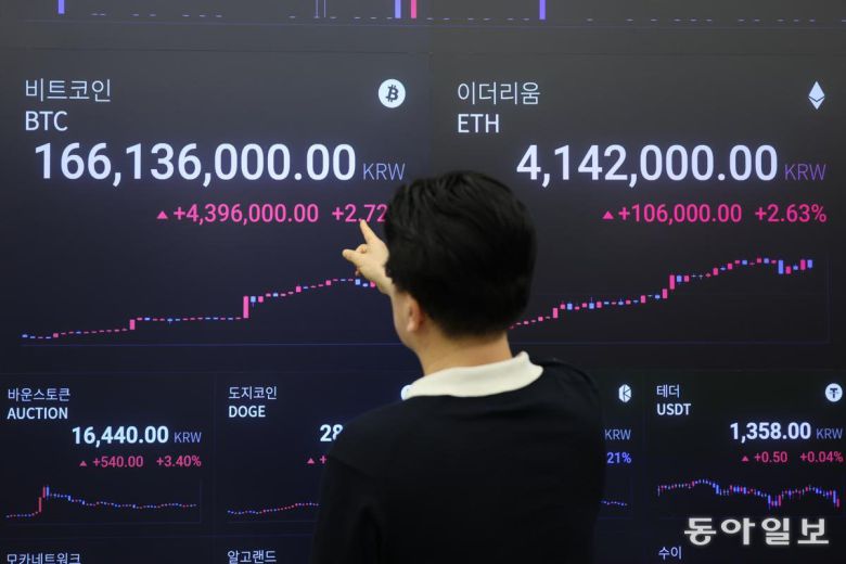 14일 서울 강남구 업비트 고객센터에서 한 고객이 전광판에 표시된 비트코인 시세를 가리키고 있다. 가상자산 정보 업체 코인마켓캡에 따르면 이날 비트코인은 장중 12만2000달러를 넘기며 신고가를 경신했다. 9일 심리적 저항선으로 여겨지던 11만 달러를 넘긴 후 5일 만이다. 전영한 기자 scoopjyh@donga.com