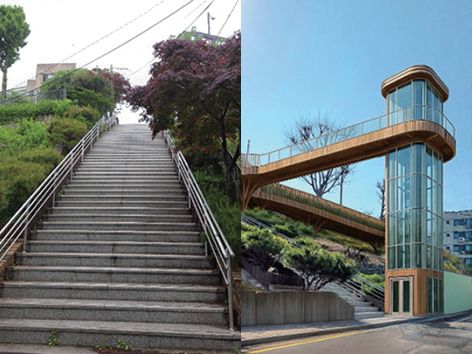 서울시가 고지대 주민을 위한 맞춤형 엘리베이터 설치 사업을 본격적으로 추진한다는 소식이다. 사업 후보자 25곳 가운데 2027년 완공될 우선 설치대상지는 광진구 중곡동, 강서구 화곡동, 관악구 청룡동, 종로구 숭인동, 중구 신당동이다. 지하철 창신역 주변 숭인동의 경사형 엘리베이터는 낙산공원과 서울한양도성길 관광 활성화에 보탬이 될 것이다. 신당동엔 휠체어와 유모차도 남산자락숲길을 편하게 이용할 수 있도록 설계가 이루어진다. 청룡동은 엘리베이터와 함께 데크길을 조성해 조망 명소로도 활용한다는 계획이다.
