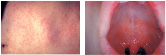 홍역 발진(왼쪽) 및 홍역으로 인한 구강 내 Koplik 반점. 미국질병관리본부